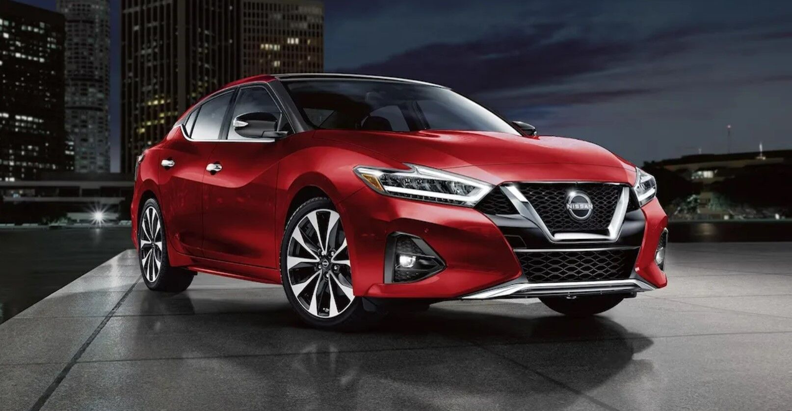 The front end of the Maxima displays elegance, and its sophisticated design features LED headlights, LED fog lights, and a black grille to complement its looks.