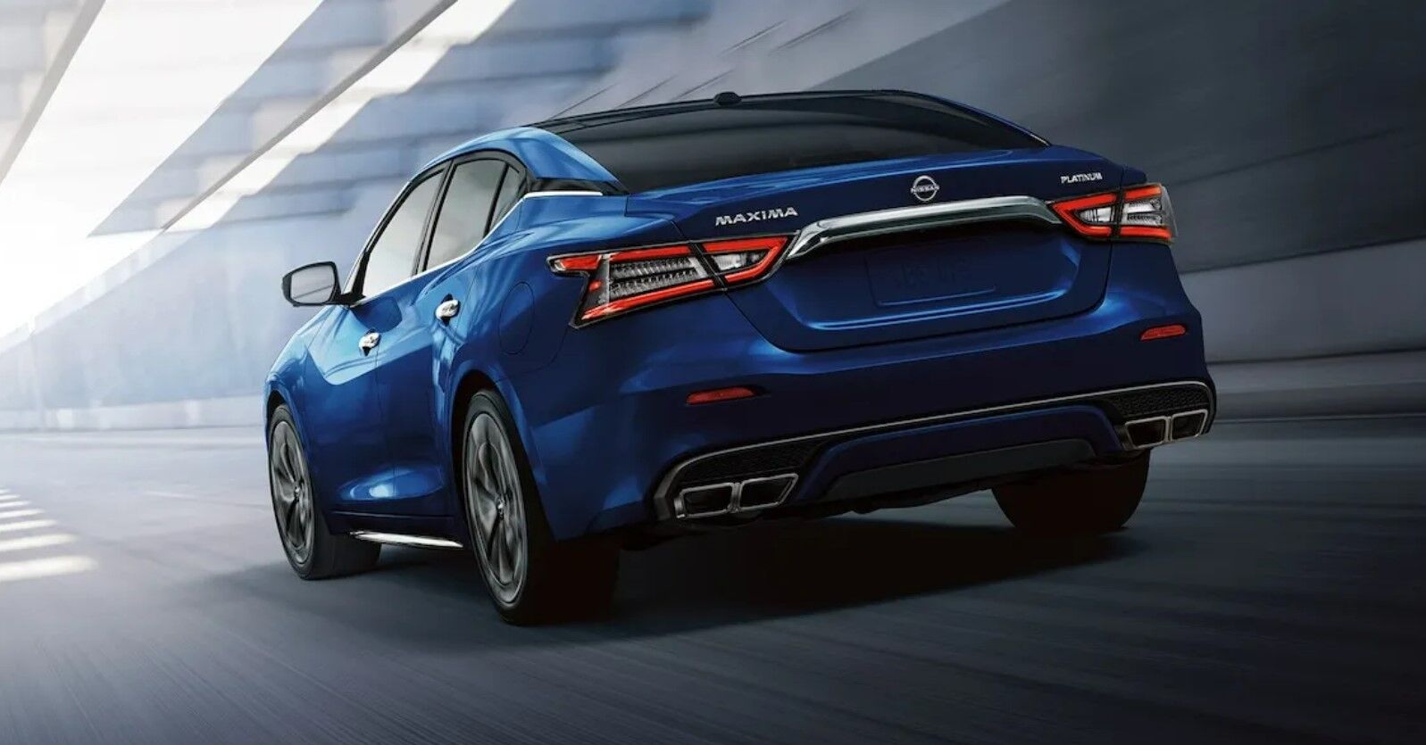 The rear end of the 2023 Nissan Maxima features uniquely shaped LED taillights and quad exhaust tips that add to the elegant and sporty look.